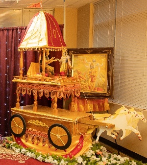 (Left) A mini chariot with Krishna and Arjuna was set up beside the altar.