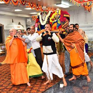 During early morning for eleven days, Swami Adhyatmanandaji conducted hour-long, free guided meditation and pranayama classes. He enthralled audiences with his commentary on Devi Saptashati and other topics. Brahmasri Narendra Kapre’s discourses in Sanskrit and Hindi were succinct, informative, and enjoyed by everyone. A highlight of the celebrations was a daily discourse on Devi Puranam and the divine mother by Santosh Kumar from Hyderabad, who is known for his talks on spiritual matters on Bhakti TV in India. His rich voice and mastery of the subject attracted many to his daily talks.