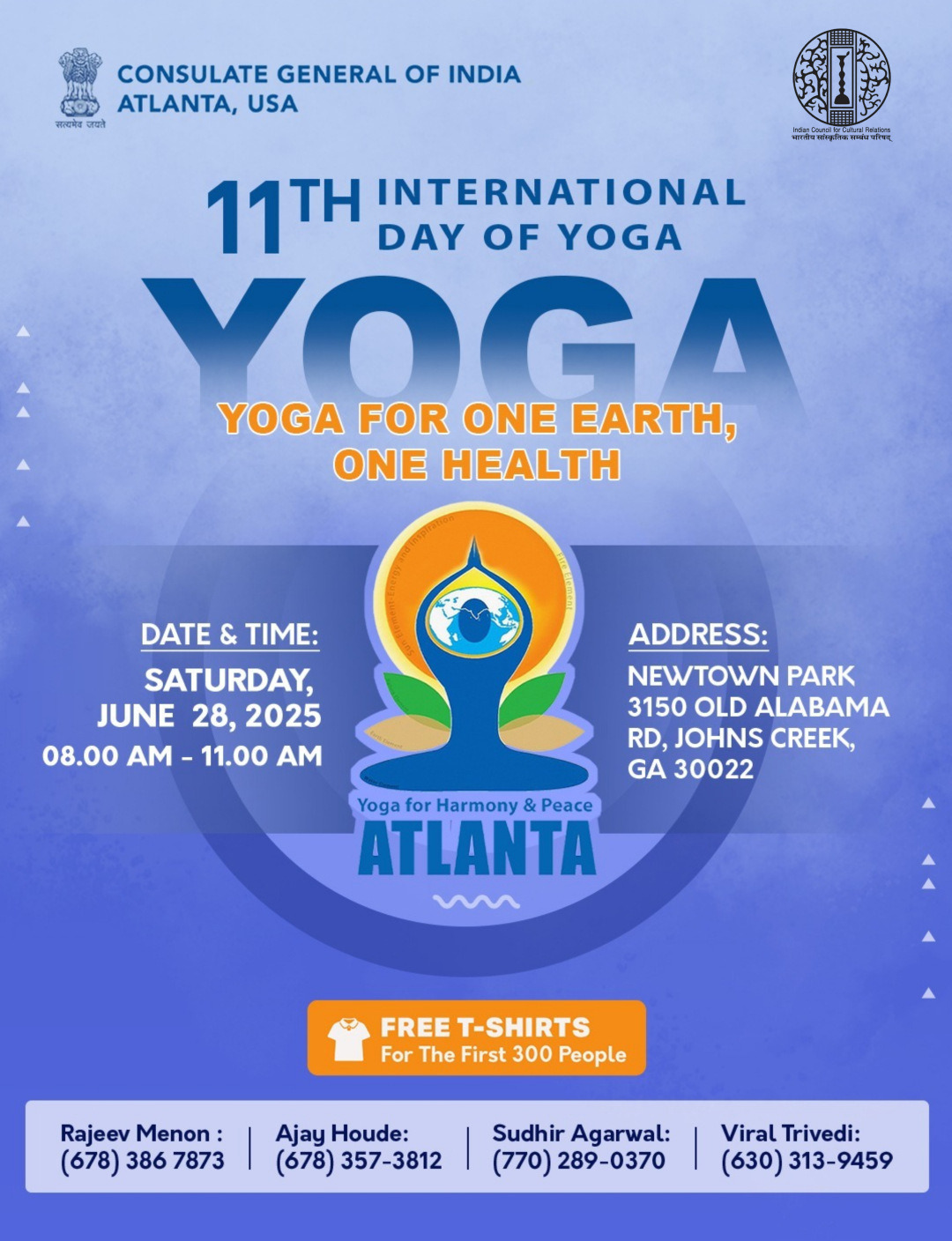 Consulate General of India, Atlanta would like to invite you and your friends for a celebration of the 11th International Day of Yoga from 8:00 AM to 11 AM on Saturday, June 28, 2025.