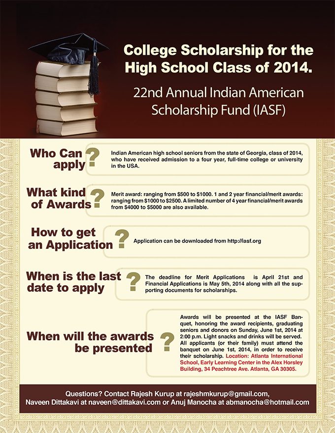 22nd Annual Indian American Scholarship Fund. Deadline for Merit Application is April 21st, 2014 and for Financial is May 5th, 2012. Award Presentation:Awards will be presented at the IASF Banquet, honoring the award recipients, graduating seniors, and donors on Sunday, June 1st, 2014. Visit: http://iasf.org