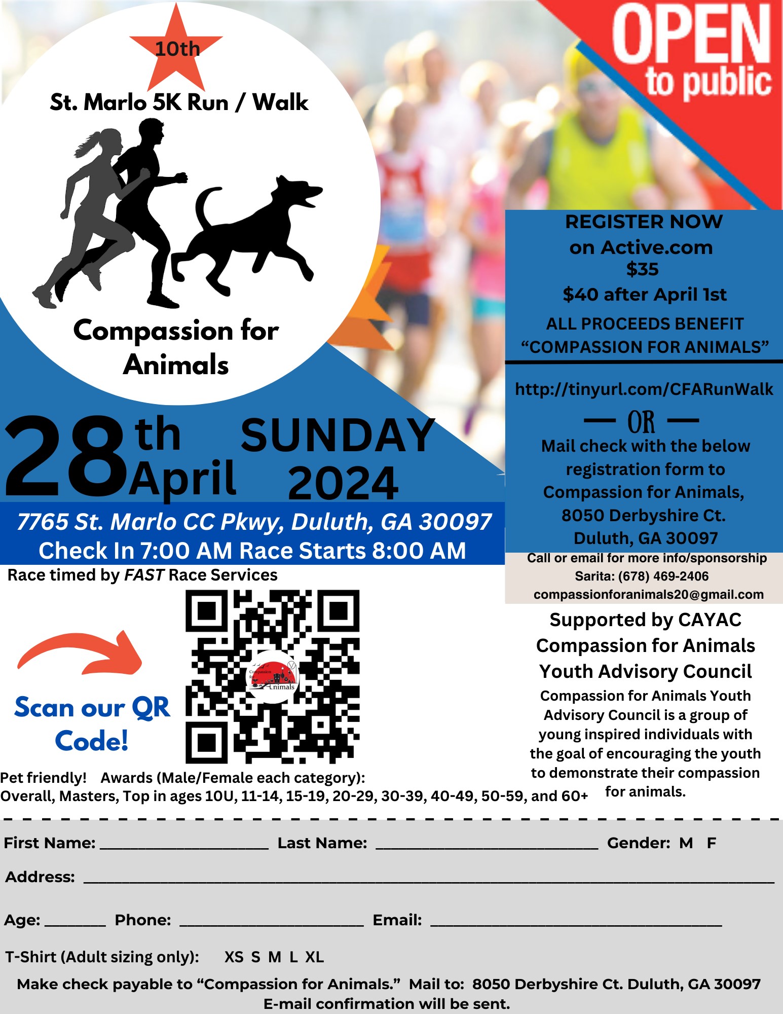 5K-Run/Walk Compassion for Animals, which is on Sunday, 28th April 24. Check in at 7 am and Run starts at 8 am sharp. This is the 10th year of this event in our beautiful neighborhood St. Marlo Country Club, Duluth, GA.