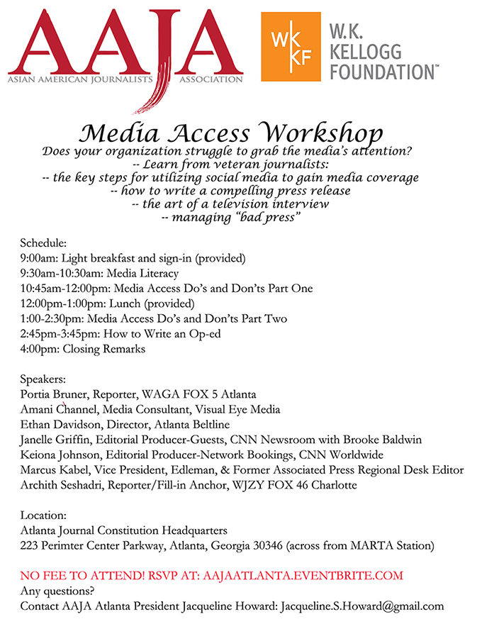 AAJA Atlanta Media Access Workshop Presented by Asian American Journalists Association and Kellogg Foundation. Asian American Journalists Association of Atlanta will be hosting a Media Access Workshop on May 17th. This is also free and open to the public.