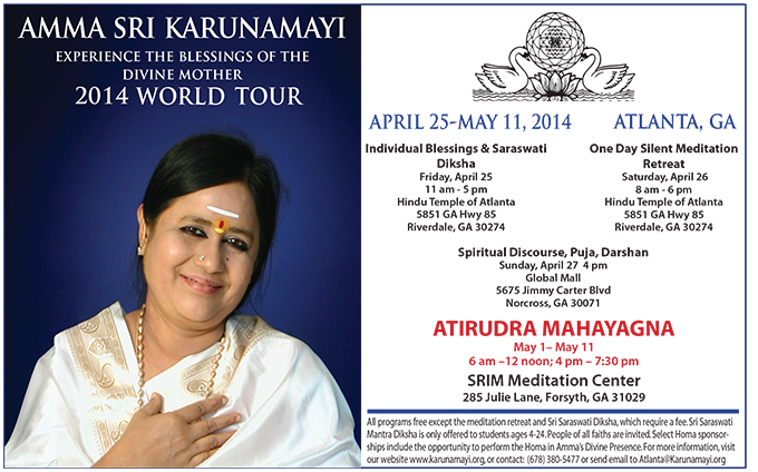 Experience the blessing of the Divine Mother. Program includes Individual blessings & Saraswati Diksha, one day silent mediation retreat, Spiritual discourse, Puja, Darshan, and Atirudra Mahayagna.