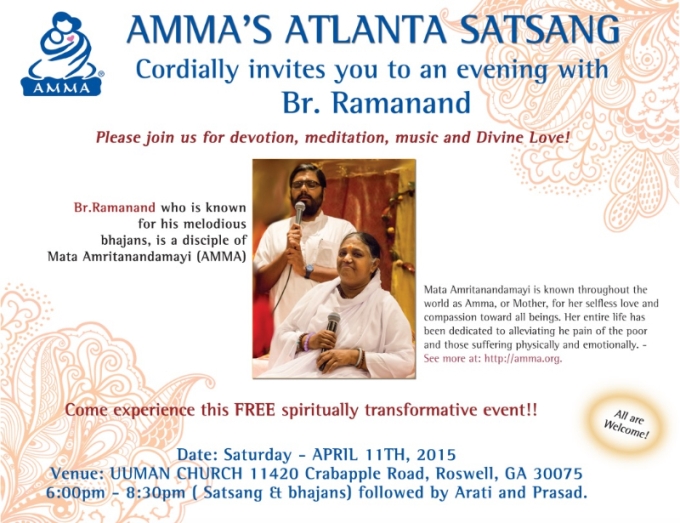 Mata Amritanandamayi (AMMA)'S ATLANTA SATSANG Cordially Welcomes All Of You To Experience Melodious Devotional Music and Meditation By Br. RAMANAND, who is a disciple of Mata Amritanandamayi(AMMA). Please Join Us and Enjoy This FREE Spiritually Transformative Event!
