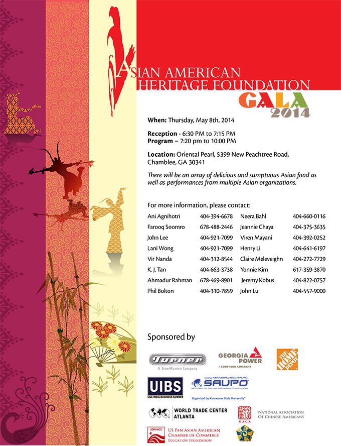 Asian American Heritage Foundation (AAHF) is a 501 C3 non-profit organization that was founded in Georgia in year 2001. Our main mission is to promote the awareness of contributions of citizens of Asian and Pacific heritage in the United States and to acknowledge achievement of citizens of Asian-American heritage. The Asian-American Heritage Foundation (AAHF) is holding its 13th annual Banquet on Thursday, May 8th, 2014 at Oriental Pearl, 5399 New Peachtree Road, Chamblee, GA30341. On behalf of the Executive Committee and Board of AAHF, it is my honor to invite you and your guest for our banquet.
