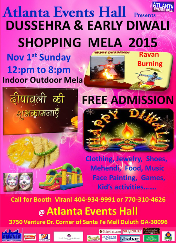 Atlanta Events Hall presents Dussehra & Early Diwali Shopping Mela 2015. Free admission. Clothing, Jewelry, Shoes, Mehendi, Food, Music, Face Painting, Games, and Kids Activities...