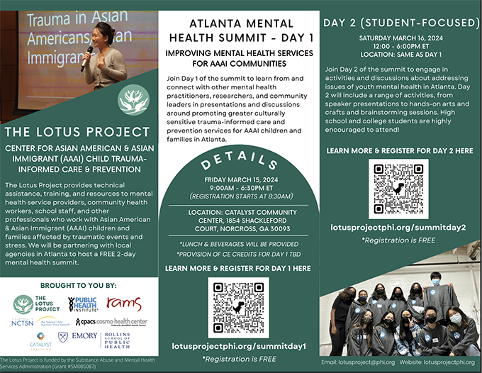 In collaboration with Emory University, the Center for Pan Asian Community Services (CPACS), and the Public Health Institute - Lotus Project, we are hosting the Atlanta Mental Health Summit: Improving Mental Health Services for AAAI Communities.