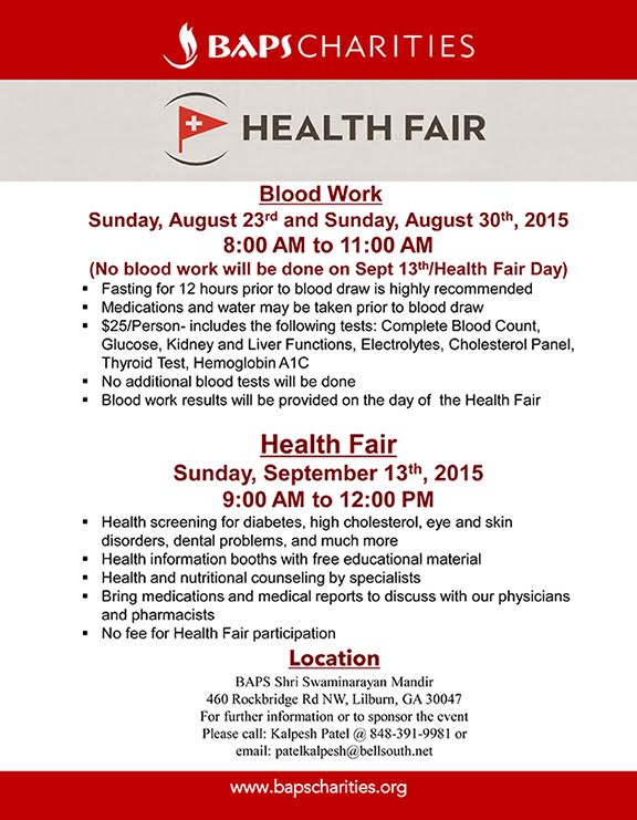 Contact: Kalpesh Patel 848-391-9981, patelkalpesh@bellsouth.net, http://www.bapscharities.org/usa/atlanta/healthfair-atlanta/