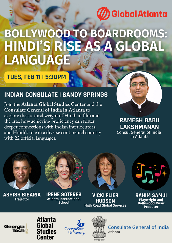 Join the Atlanta Global Studies Center, a collaboration between Georgia Tech and Georgia State University; and the Consulate General of India in Atlanta to explore the cultural weight of Hindi in film and the arts, how achieving proficiency can foster deeper connections with Indian interlocutors, and Hindi’s role in a diverse continental country with 22 official languages.
