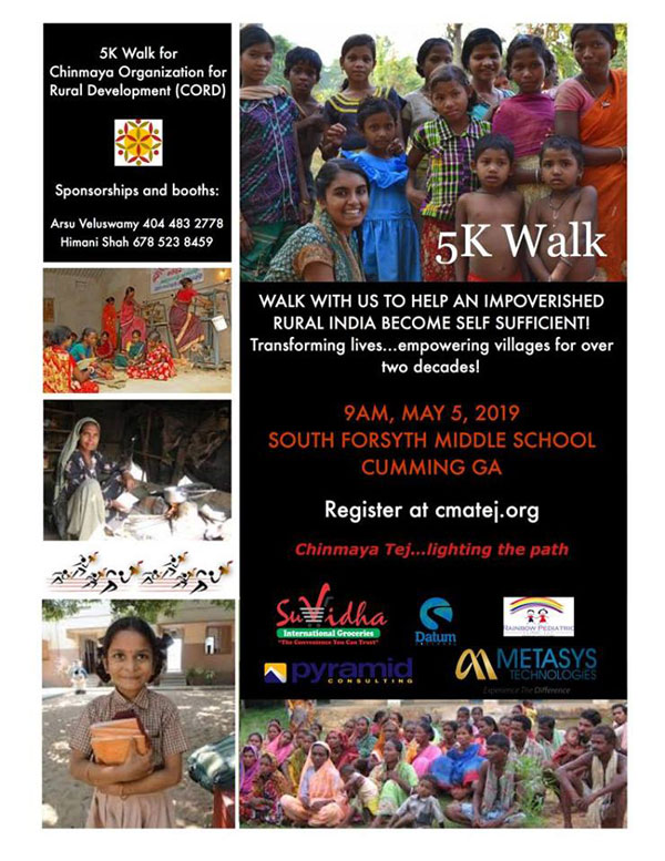 Come, join us for our 5K Walkathon supporting the many noble social services initiatives (child education, handicapped care and many more) thru CORD (Chinmaya Organization for Rural Development)