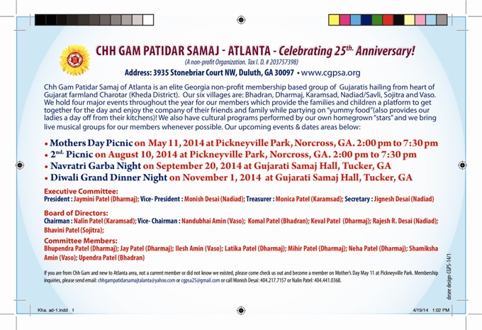 Contact: cgpsa25@gmail.com or Manish Desai, 404-217-7157.