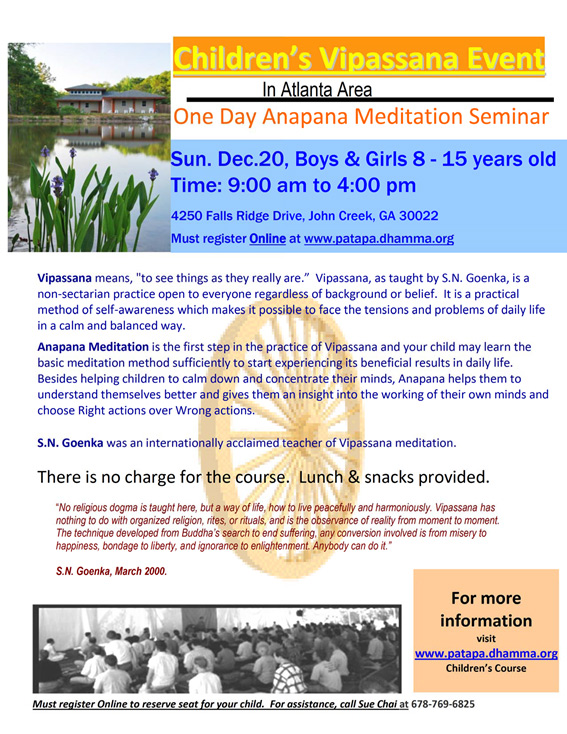 One day Anapana Meditation Seminar. The registration is now open at www.patapa.dhamma.org and parents can apply for children course scheduled for Dec,20th,2015.
