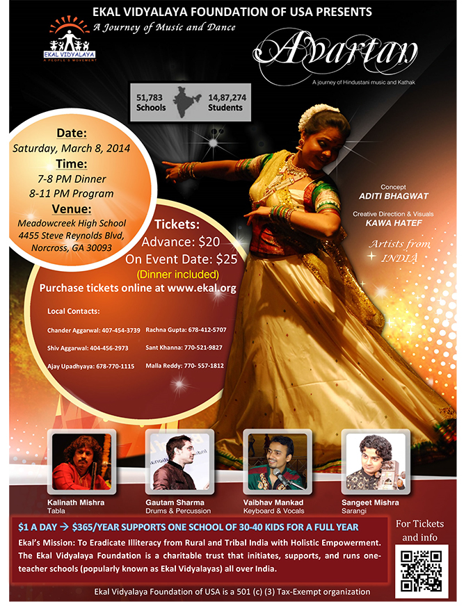 Ekal Vidyalaya foundation of USA presents a journey of Music & Dance - Avartan. A Journey of Hindustani Music and Kathak. Fusion of Classical Dances & Bollywood Melodies by Aditi Bhagvat and her Troupe from India.