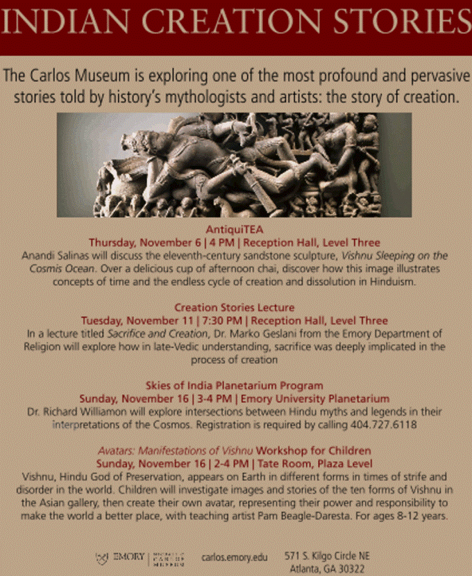 Carlos Museum members at the Corinthian, Curators' Council, Director's Council, and Partner levels are invited to a Creation Story-themed docent tour in celebration of the Year of Creation Stories at Emory. Light refreshments will be provided. RSVP by phone to 404-727-2623 or emailcarlosmembership@emory.edu.