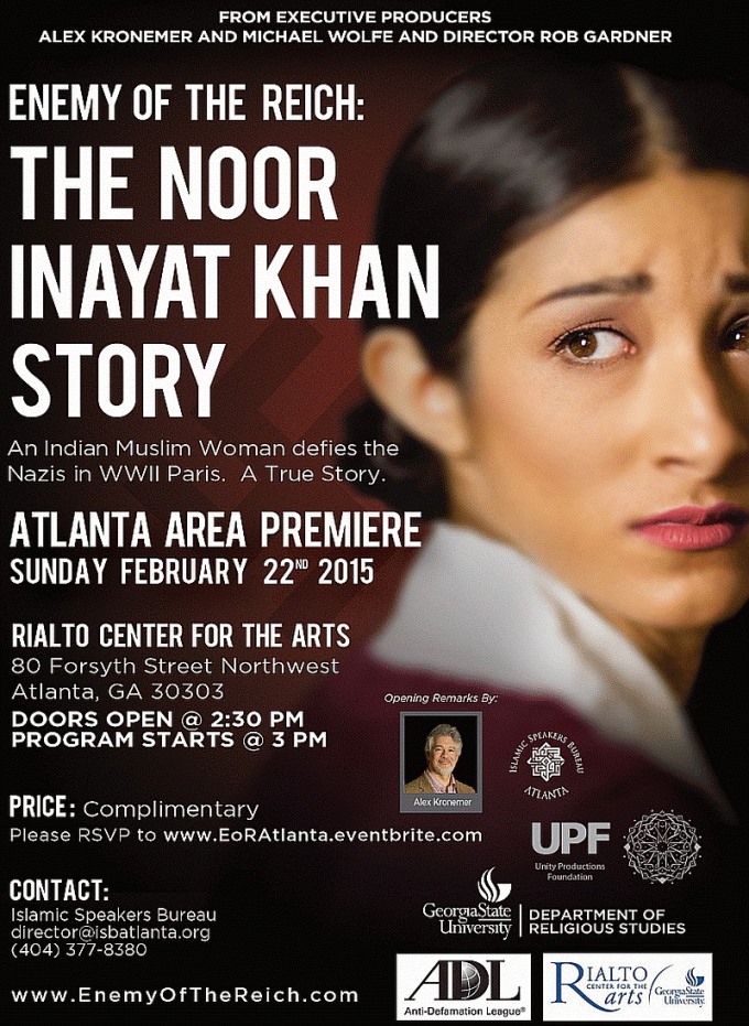 The Islamic Speakers Bureau, Georgia State University Religious Studies Department, Rialto Center for the Performing Arts Theater, and the Anti-Defamation League are collaborating to bring the Unity Production Foundation film Enemy of the Reich: The Noor Inayat Khan Story The screening is free and open to the public; please invite your friends! Seats are limited, so you must RSVP.
