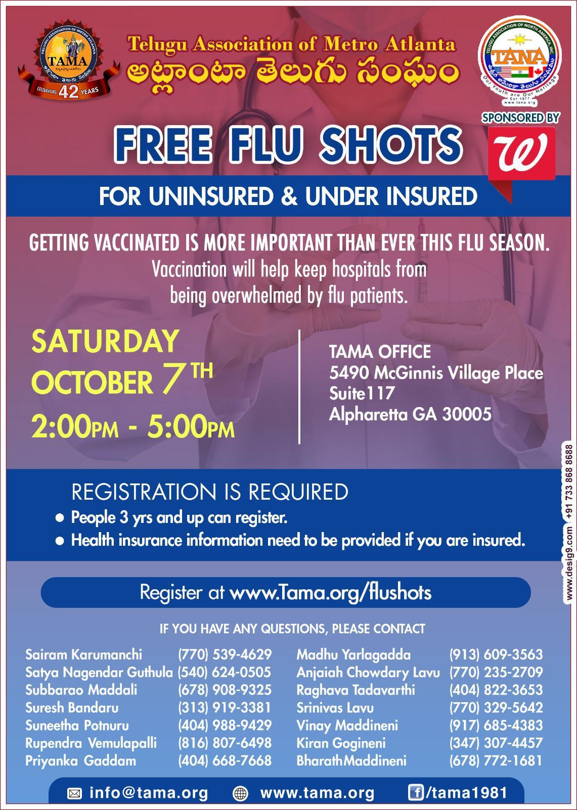 TAMA, TANA, in association with Walgreens ‘FREE FLU SHOTS’ this Sat, 7th Oct, 2PM - 5PM @ TAMA office.