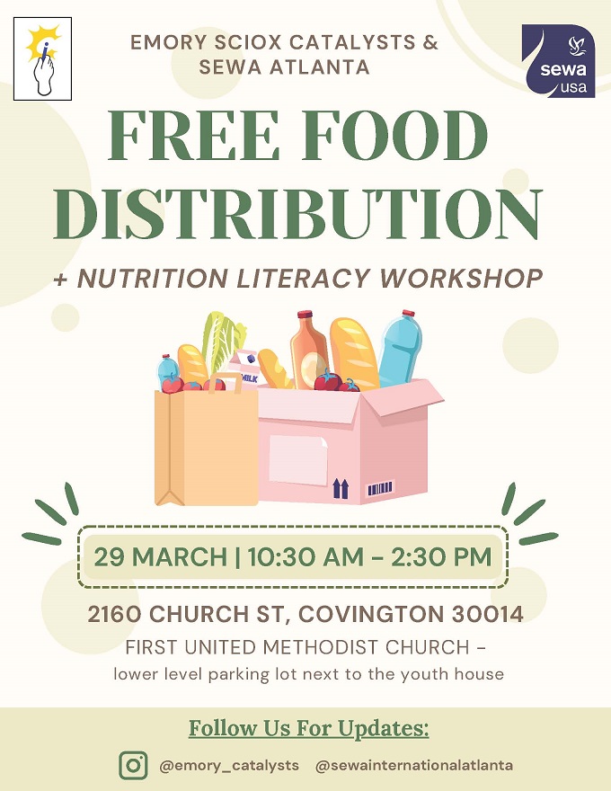 Sewa Atlanta and Emory SciOx Catalysts invite members of the press to cover a Free Food Distribution & Nutrition Literacy Workshop on Saturday, March 29, from 10:30 AM to 2:30 PM at First United Methodist Church in Covington, GA. This initiative aims to provide essential food supplies and educational resources to families in need, highlighting ongoing efforts to combat food insecurity while fostering community well-being.