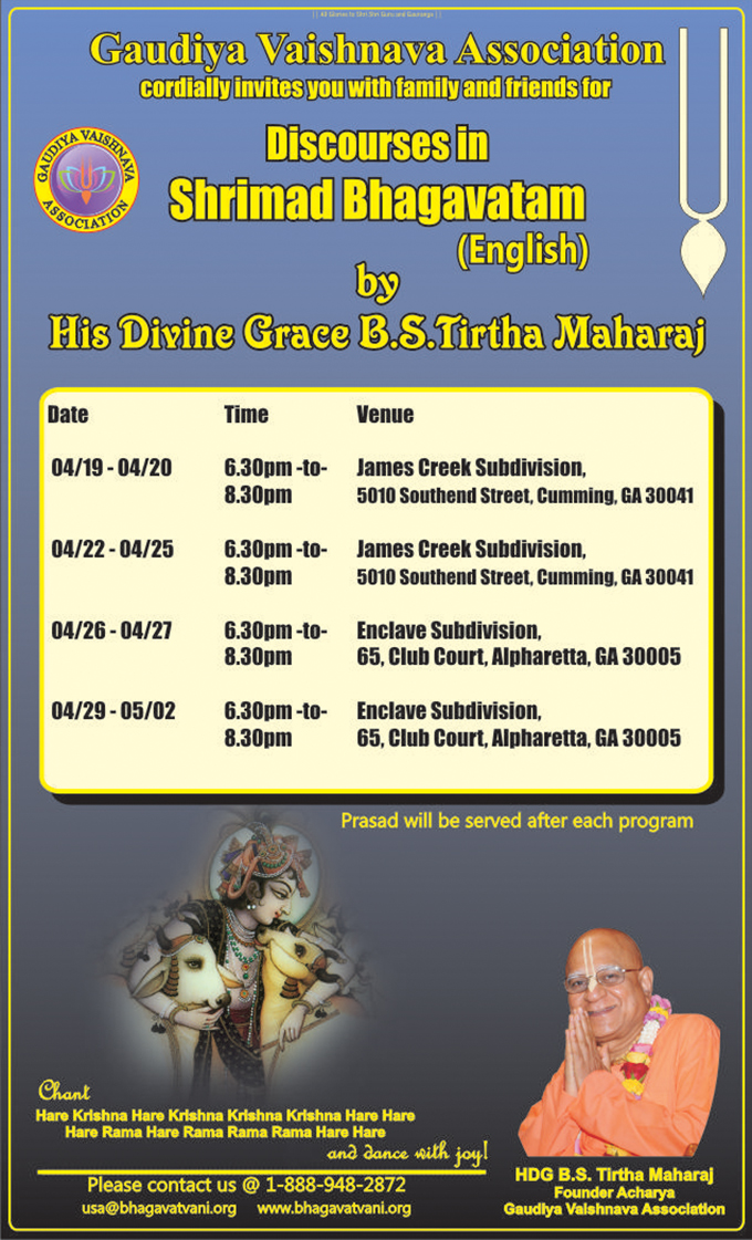 Discourses on Shrimad Bhagavatam presented daily in English by His Divine Grace B.S.Tirtha Maharaj, Gaudiya Vaishnava Association. Alpharetta. His Divine Grace B.S. Tirtha Maharaj is one of the most philosophically perfect, astoundingly knowledgeable, unbelievably humble and exceptionally dignified Acharyas of recent times. Dinner prasadam will be served after each program.