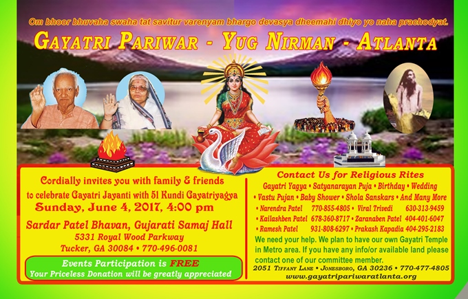 Contact: Gayatri Pariwar Atlanta, 2051 Tiffany Lane, Jonesboro, GA 30236, 770-477-4805