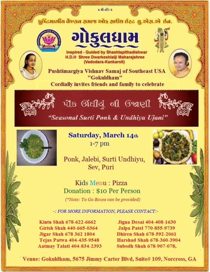 Venue: Gokuldham Haveli, Suite #109, Global Mall, 5675 Jimmy Carter Blvd., Norcross, GA.