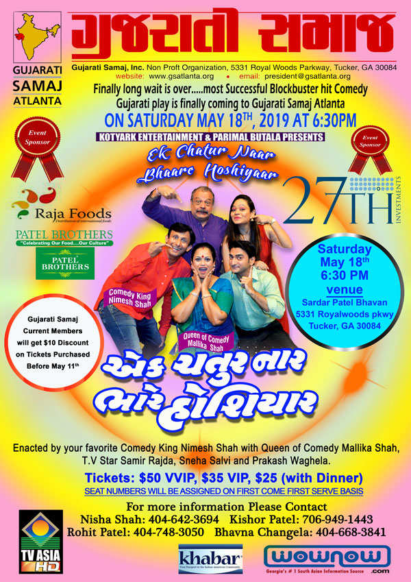 Gujarati Samaj Current Members will get $10 Discount on Tickets if Purchased before May 11th.(valid for Registered Gujarati Samaj of Atlanta Members only)