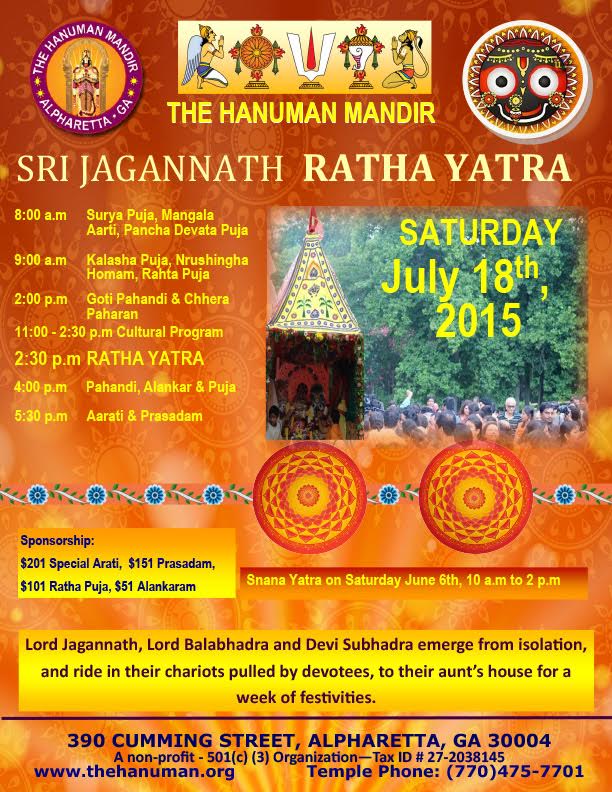 Please Join Hanuman Mandir, Alpharetta to celebrate the most awaited ceremony of Lord Jagannath Parivaar RATHA YATRA this Saturday July 18th from 3pm - 6pm