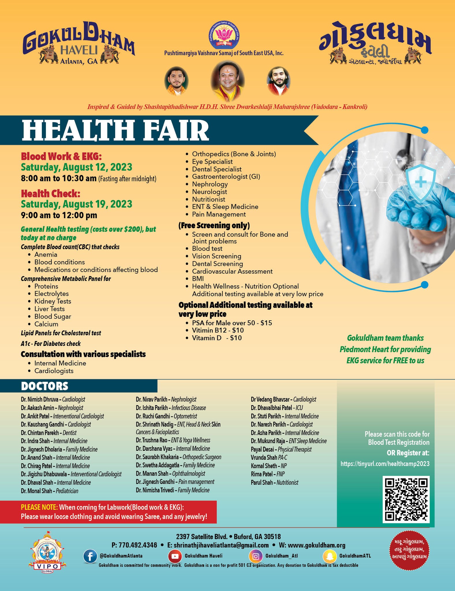 Aug 12 & 19 2397 Satellite Blvd, Buford, GA 30518 Ph: 770-492-4346 Email: shrinathjihaveliatlanta@gmail.com Website: www.gokuldham.org Blood Work & EKG: Saturday, August 12, 2023 8:00 am to 10:30 am (Fasting after midnight) Health Check: Saturday, August 19, 2023 9:00 am to 12:00 pm Open to @everyone