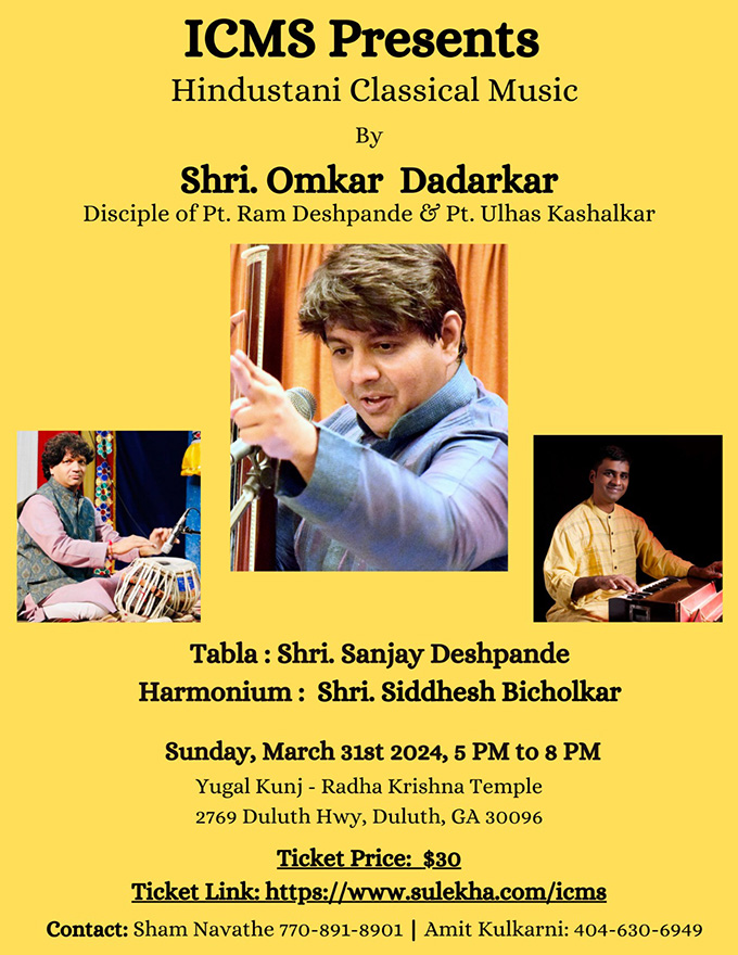 ICMS is announcing a classical vocal concert by Omkar Dadarkar (nephew of famous Manik Verma) on March 31st at Yugal Kunj from 5 to 8 pm. Accompanied by Sanjay Deshpande on Tabla and Siddhesh Bicholikar on Harmonium. Admission is $30 and tickets can be bought at www.sulekha.com/icms (no additional ticketing fee). Please attend in large numbers