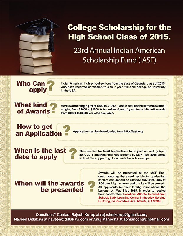 Indian American High School Seniors from the State of Georgia, class of 2015 who have received admission to a four year, full-time college or university in the USA.