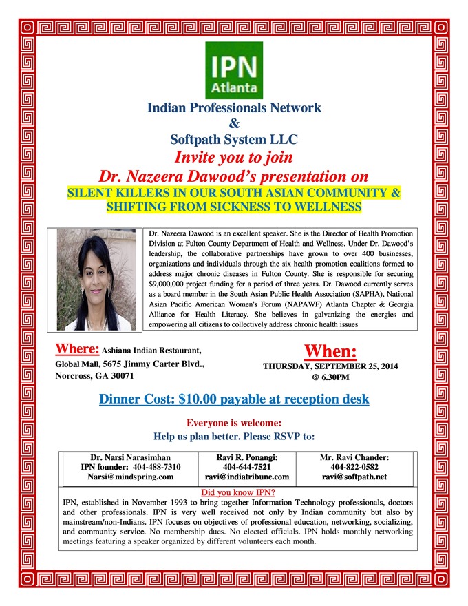 About Indian Professionals Network (IPN): Indian Professionals Network (IPN) was originally founded in 1993 by Narsi Narasimhan. After holding monthly meetings for more than 12 years, it was put on hold since there are other excellent professional networking opportunities offered in Atlanta by GIACC, NetIP Atlanta and TiE Atlanta. To fill a void in the community, we are back.