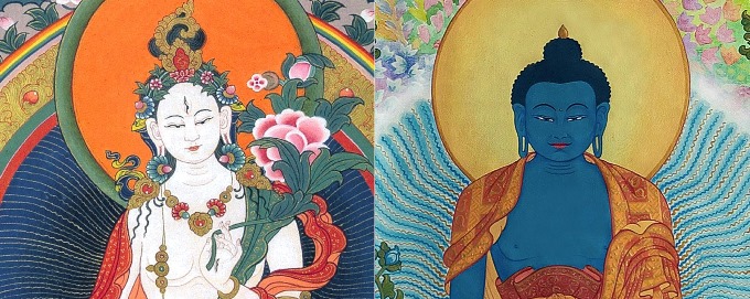 The second chant will be the Bhaiṣajyaguru (Medicine Buddha) Mantra. The Medicine Buddha is the highest possible model of a healer. Among the 12 vows Bhaiṣajyaguru is said to have taken is that of curing just by the invocation of his name or the thought of Him. He was known as the dispenser of spiritual medicine that could cure spiritual, psychological, and physical disease. This Buddha is not connected to simply for healing powers alone; he is the form of the Buddha-nature that we aspire to realize in ourselves. Through the practice of meditation on the Medicine Buddha, one can generate enormous healing power for self and for the healing of others.