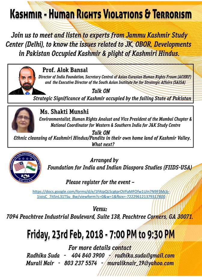 Join us to meet and listen to experts from Jammu and Kashmir study circle (Delhi), to know issues related to POJAK, OBOR and plight of Kashmiri Hindus.