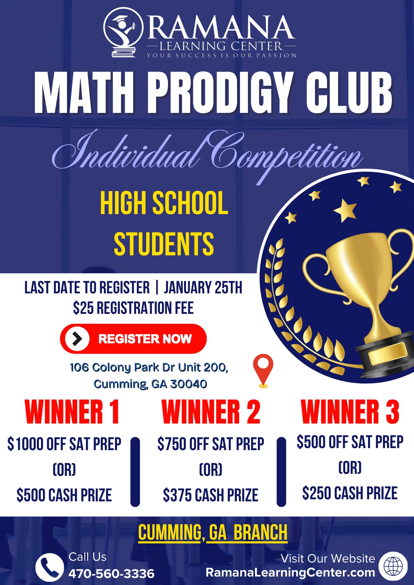 High school math enthusiasts, it’s time to shine! Join the Math Prodigy Club Individual Competition at Ramana Learning Center and win exciting prizes. Register by January 25th for just $25!