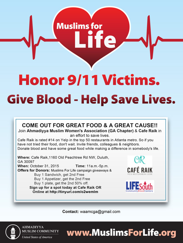 "Muslims for life" blood drive scheduled for October 31 at Cafe Raik in Duluth. Honor 9/11 Victims. Give Blood - Help Save Lives.