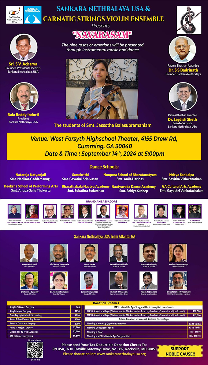 Metro Atlanta’s violin guru Smt. Jassotha Balasubramaniam is organizing Navarasam with 8 popular dance academies to raise the funds for Sankara Nethralaya.