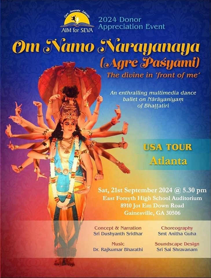 The enthralling multimedia dance drama is an artistic depiction of stories from Narayaneeyam (composed by Sri Narayana Bhattathiri, concept & narration by Sri Dushyant Sridhar, Choreographed by Smt. Anitha Guha, supported by Sri. Rajkumar Bharathi (poet Bharathiyar’s grandson) and Sri. Sai Shravanam.