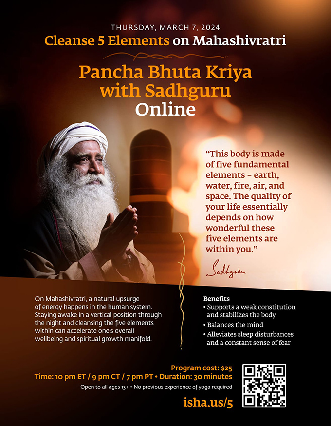 Sadhguru will be offering the powerful Yogic process of Pancha Bhuta Kriya or elemental cleansing on the auspicious night of Mahashivratri. On this night, a natural upsurge of energy happens in the human system. Staying awake and in a vertical position through the night and cleansing the elements within can accelerate one’s overall wellbeing and spiritual growth manifold.
