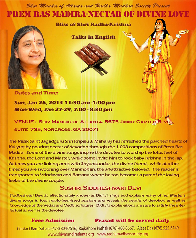 Shiv Mandir of Atlanta and Radha Madhav Society present Prem Ras Madira - Nectar of Divine Love. Bliss of Shri Radha-Krishna - Talks in English.