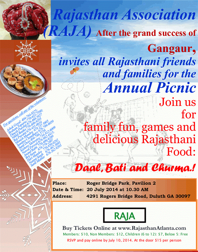 After the grand success of Gangaur, Rajasthan Association (RAJA), invites all Rajasthani friends and families for the annual picnic. Join us for family, fun, games and delicious Rajasthani food.