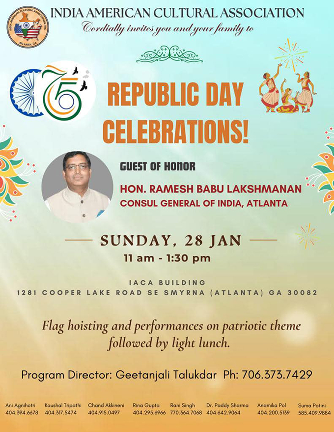 This year, India will be marking its 74th Republic Day and IACA (India American Cultural Association, Atlanta, GA) will proudly celebrate Republic Day