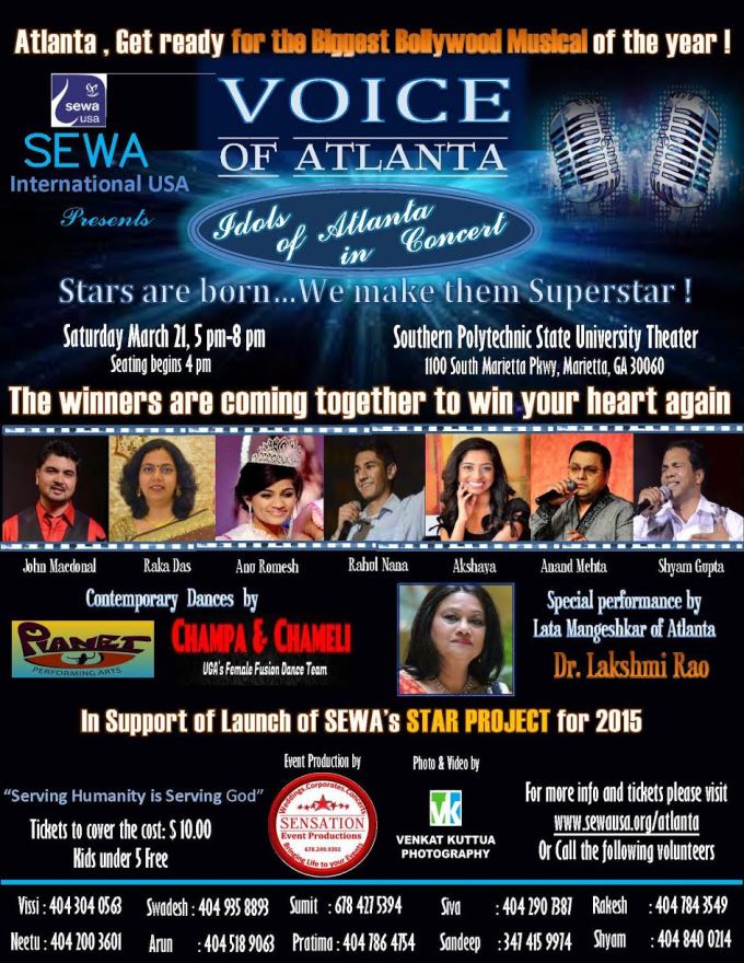 After a super successful Holi, THE NEXT BIG THING IS HERE....Please join us for a fun filled musical evening VOICE OF ATLANTA, with power packed Dances by Atlanta's Most Energetic Dance Teams (UGA'S Champa Chameli and Planet-U performing arts). The talented singers who wowed the audience and judges are back once again to win your hearts and all for a cause as SEWA USA launches its star project " FAMILY SERVICES" - A much needed system to support the Indian families in case of unforeseen circumstances. Please join us on 21 March to know more about the SEWA'S NEW INITIATIVE FOR MAKING THE WORLD A BETTER PLACE FOR ALL. Buy your tickets today at :http://www.sewausa.org/civicrm/event/register?id=46&reset=1