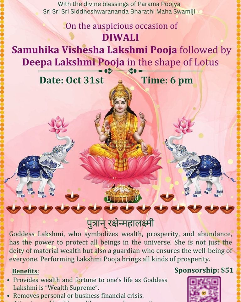 On the auspicious occasion of Diwali. Sree Devi Peetham invites all the devotees to the Samuhika Vishesha Lakshmi Pooja followed by Deepa Lakshmi Pooja.