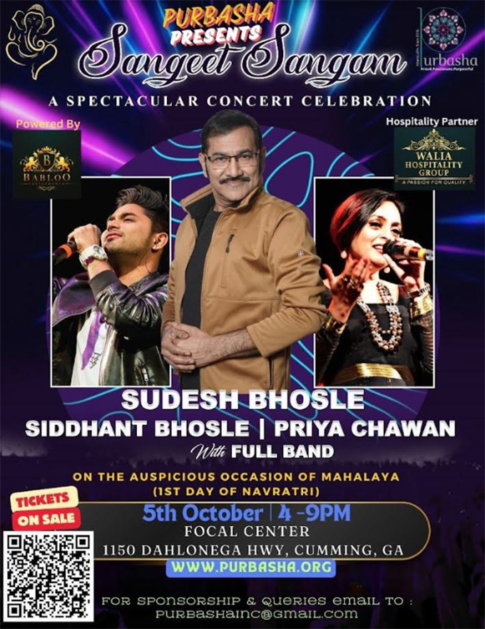 The powerhouse of Talent - The playback voice of our beloved BigB for a long time - MR. SUDESH BHOSLE - LIVE on 5th October with his son Siddhant Bhosle and Priya Chawan, Coming to Atlanta to entertain all of us !! Save the Date ...and lookout for more details...coming soon....