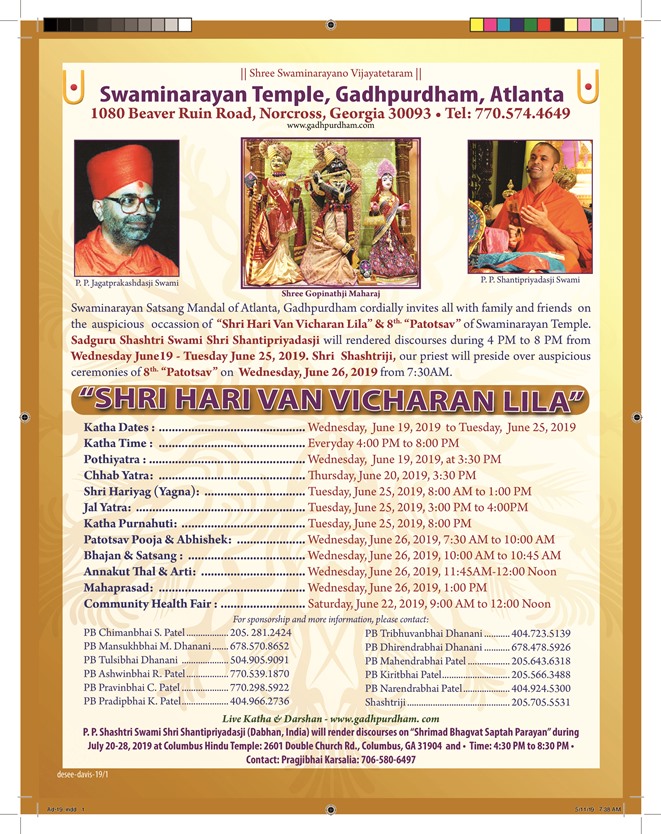 Venue: Shree Swaminarayan Satsang Mandal of Atlanta, GA, 1080 Beaver Ruin Road, Norcross, GA 3009