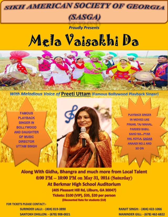 Sikh American Society of Georgia is hosting Mela Vaisakhi Da on May 31st with Preeti Uttam a famous Bollywood playback singer, first time in USA at Berkmar High School Auditorium, Lillburn GA. Additionally, professional Bhangra, Giddha and cultural teams will entertain the audience and bring back the memories of our Mother Land. Please see the attached flyer for details and tickets.