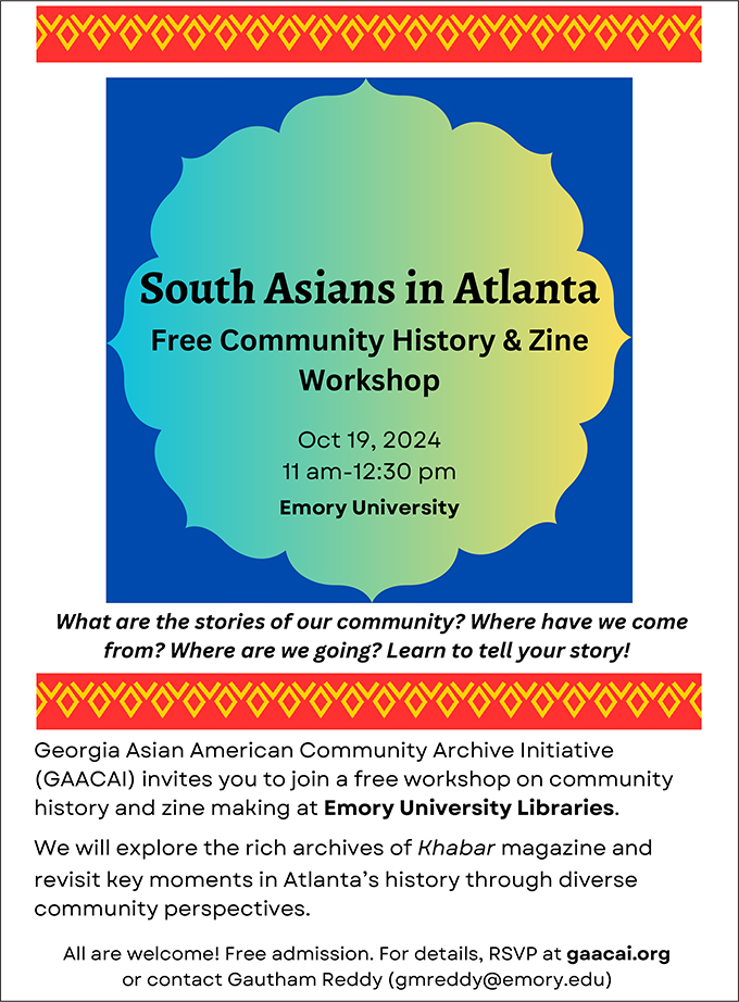 Join the Georgia Asian American Community Archive Initiative (GAACAI) on October 19th for a free community history & zine-making workshop. We will explore the vibrant history of South Asians in Atlanta and offer the opportunity to craft your very own community history zine. Anyone interested in learning about the history of Atlanta, immigration in the south, and the experiences of Asian Americans is welcome to attend.