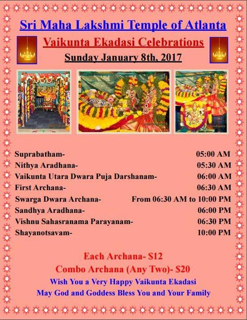 Vaikunta Ekadasi on Sunday January 8th, 2017 and Makara Sankranthi January 13th, 14th, 15th, 2017 Celebrations. For both the events, there will be Annadanam the whole day. Please check out flyers for program details.