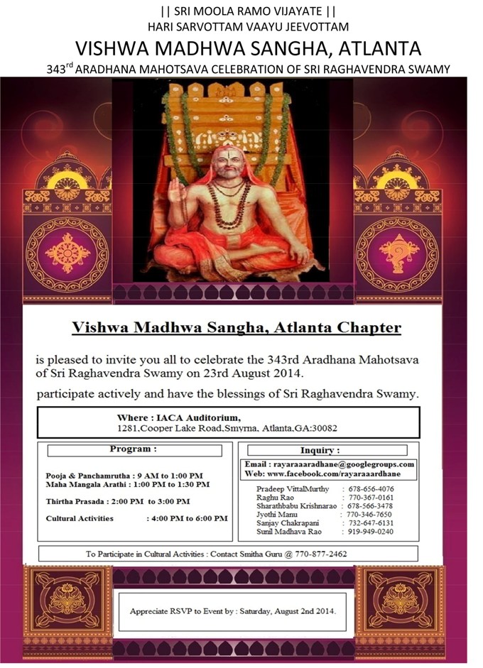 Contact: RSVP by 8/2 to rayaraaaradhane@googlegroups.com, www.facebook.com/rayaraaardhane, Pradeep, 678-656-4076.