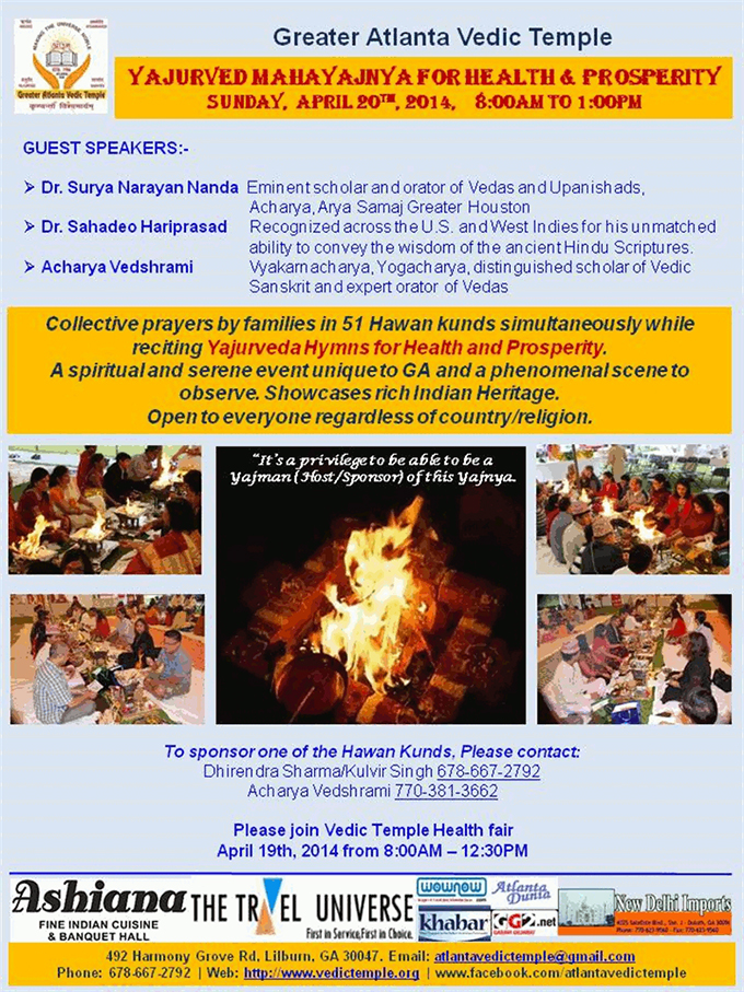 Description : Join us in these unique, collective prayers for Health and Prosperity. Give the ahuti (oblations) while reciting holy Hymns of YajurVed. Offerings given in around 51 Hawankunds simultaneously, by 50+ families. A phenomenal scene for everyone to observe. For more information, please visit upcoming events section of our website.
