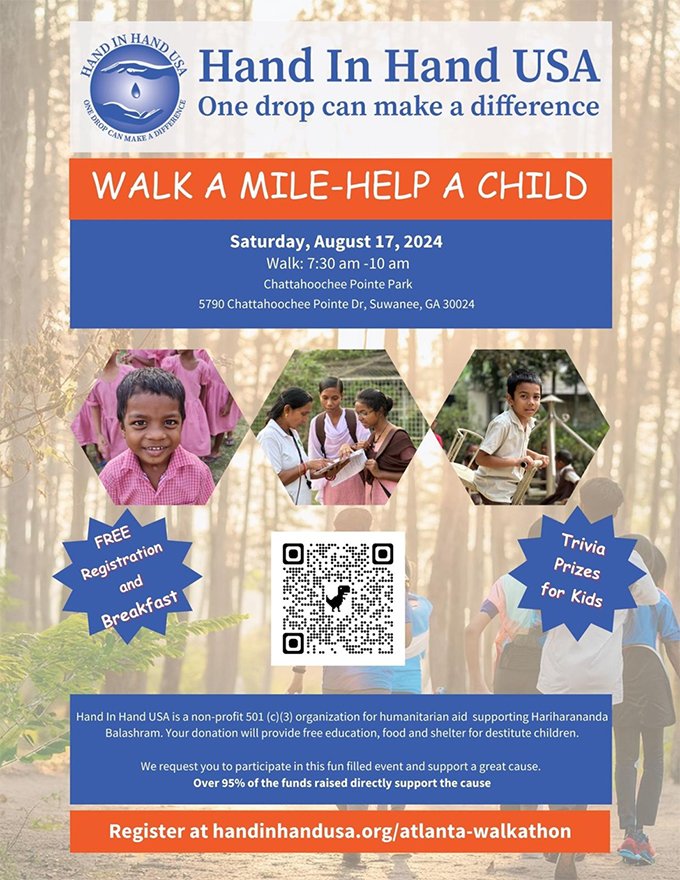 The first walkathon in Atlanta by Hand In Hand USA (“HIH USA”), a non-profit organization based in the USA, was a grand success!! The Walkathon is back this year with aplomb on August 17th from 7.30-10am at the picturesque Chattahoochee Pointe Park in Forsyth County. There is no registration fee to sign up and free breakfast along with trivia prizes for children promises to make it a memorable family fun day for a noble cause.